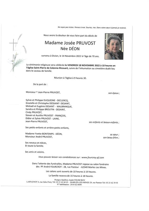 Décédée à Divion (62460, France) le lundi 14 novembre 2022 à l'âge de 70 ans