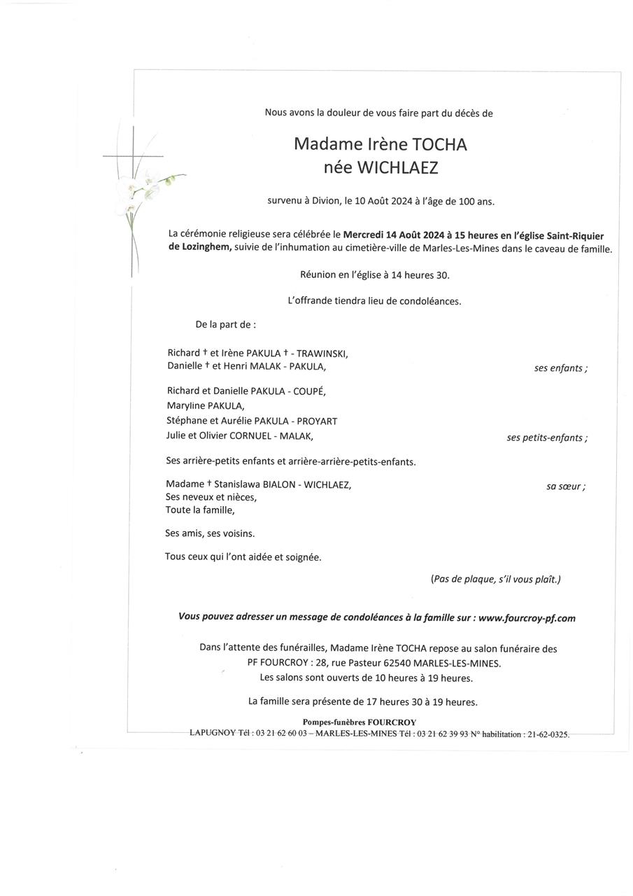 Madame Irène TOCHA née WICHLAEZ