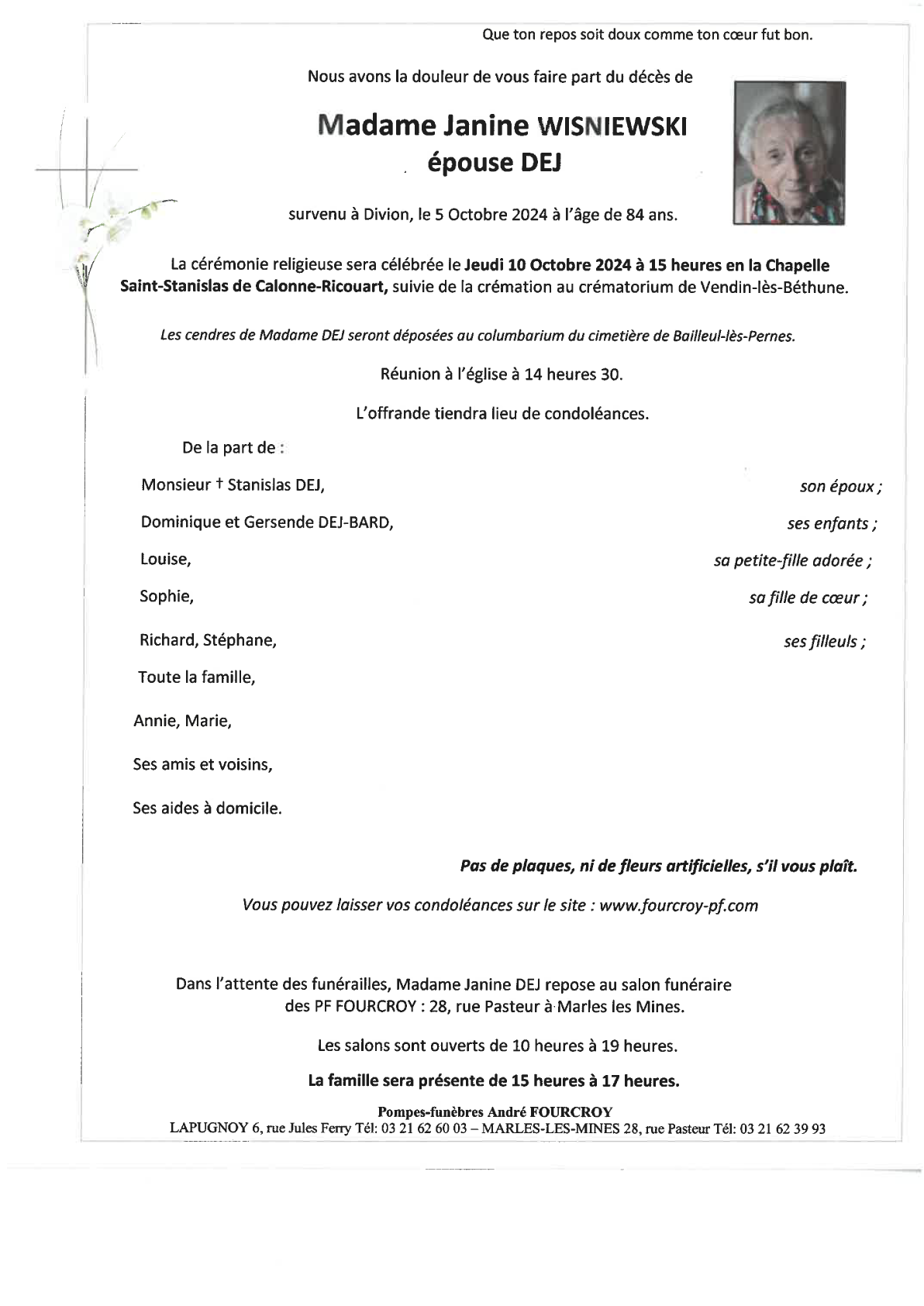 Décédée à Divion (62460, France) le samedi 5 octobre 2024 à l'âge de 84 ans