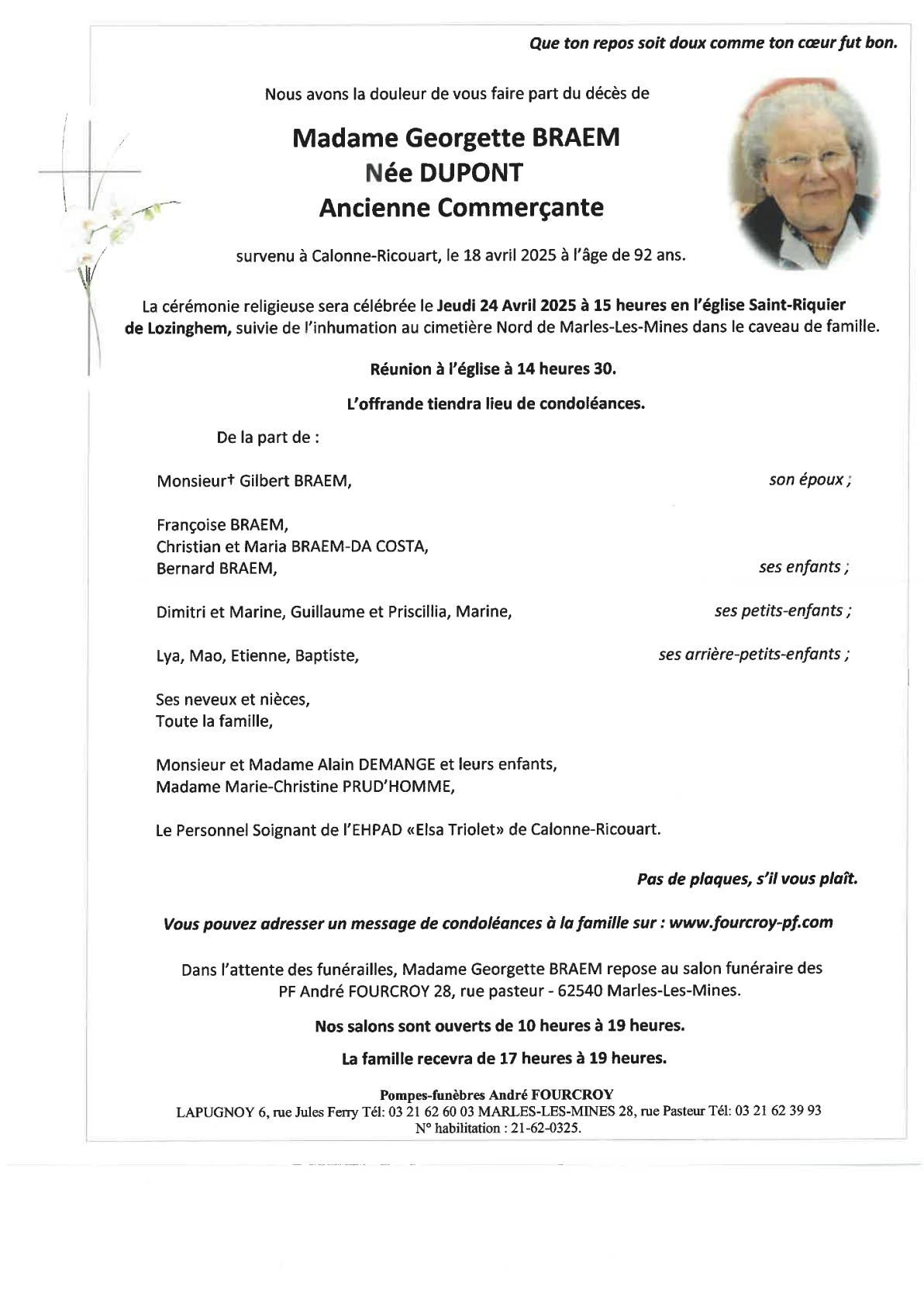 Décédée à Calonne-Ricouart (62470, France) le vendredi 18 avril 2025 à l'âge de 92 ans