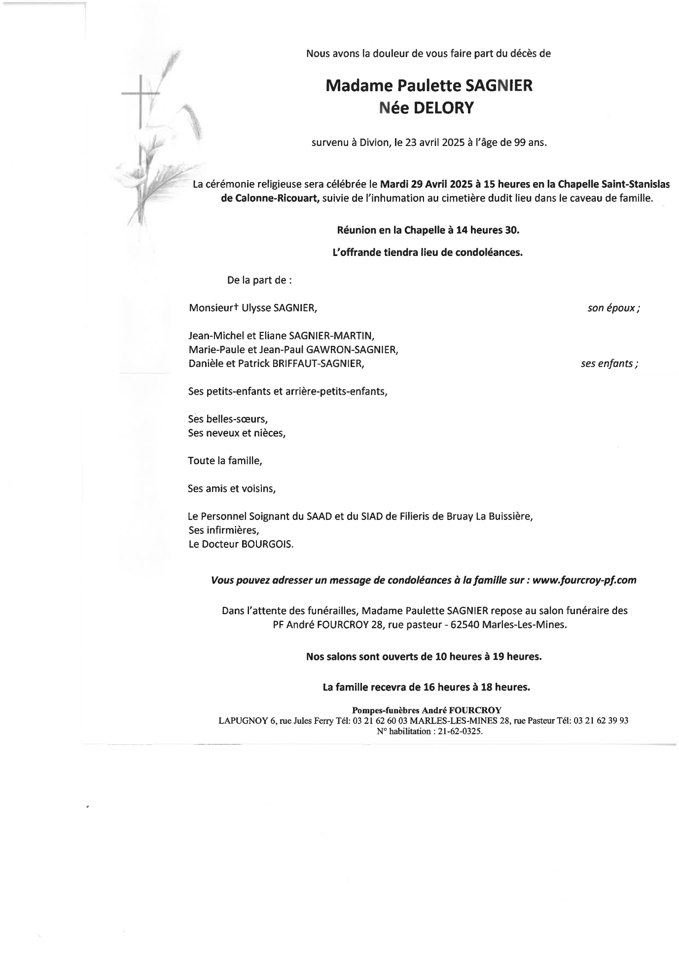 Décédée à Divion (62460, France) le mercredi 23 avril 2025 à l'âge de 99 ans