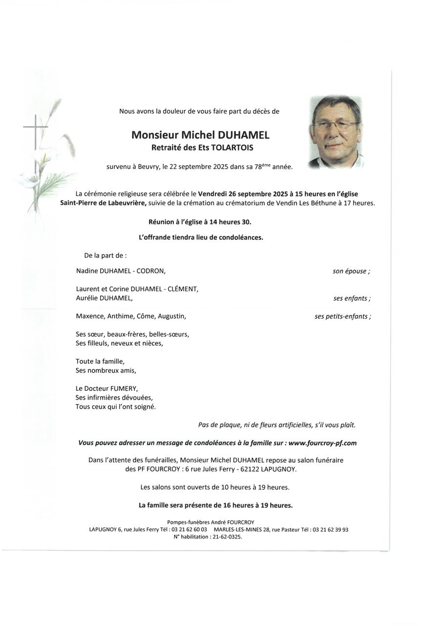 Décédé à Beuvry (62660, France) le lundi 22 septembre 2025 à l'âge de 77 ans