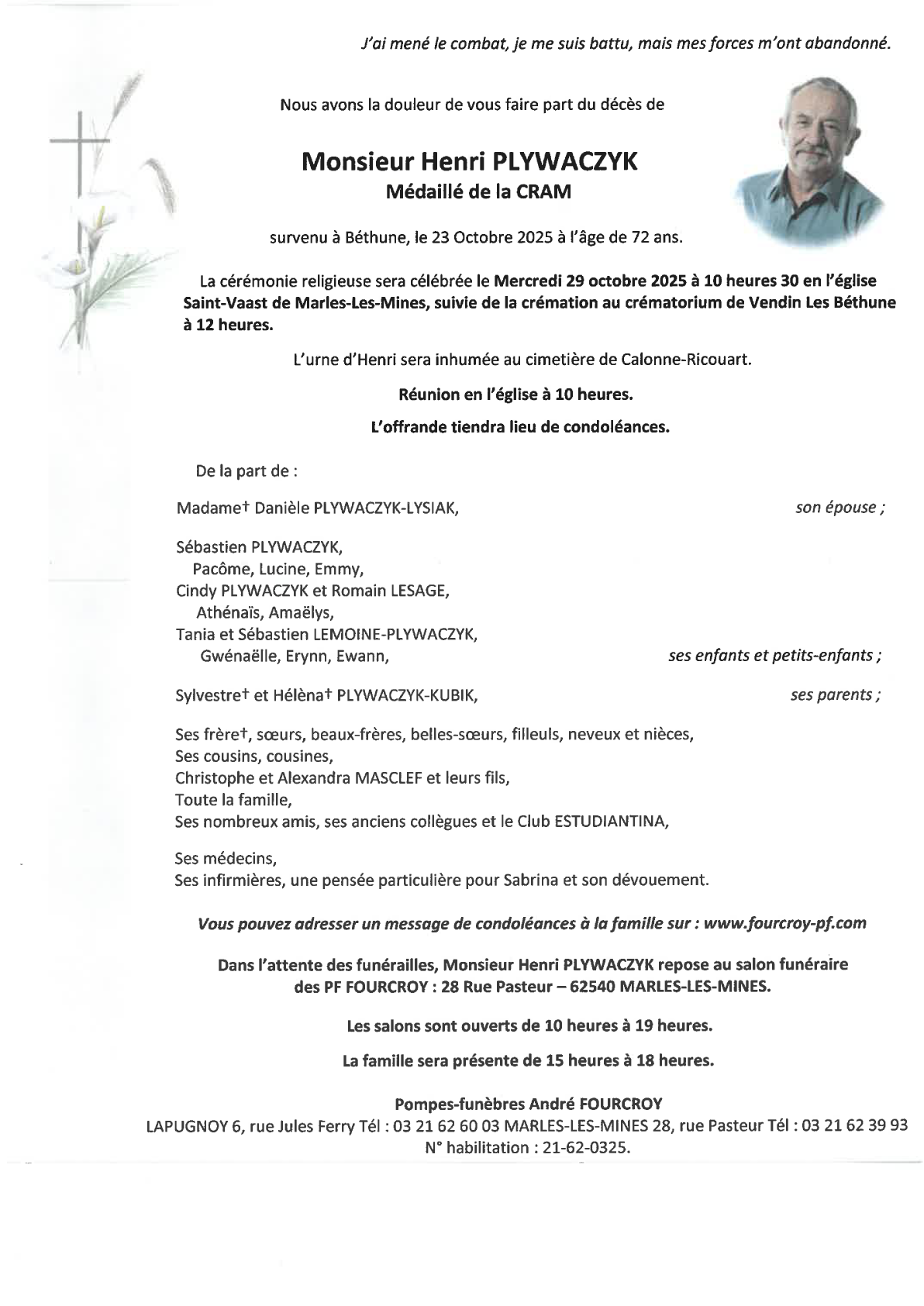 Décédé à Béthune (62400, France) le jeudi 23 octobre 2025 à l'âge de 72 ans