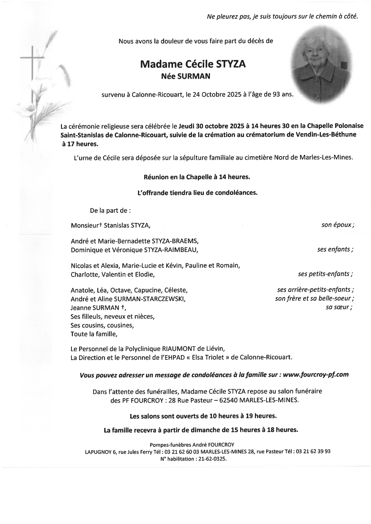 Décédée à Calonne-Ricouart (62470, France) le vendredi 24 octobre 2025 à l'âge de 93 ans