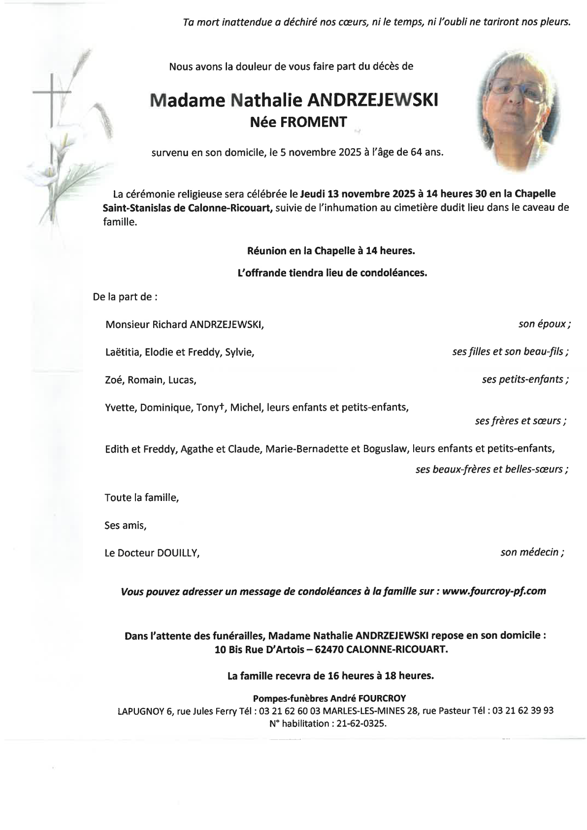 Décédée à Calonne-Ricouart (62470, France) le mercredi 5 novembre 2025 à l'âge de 64 ans