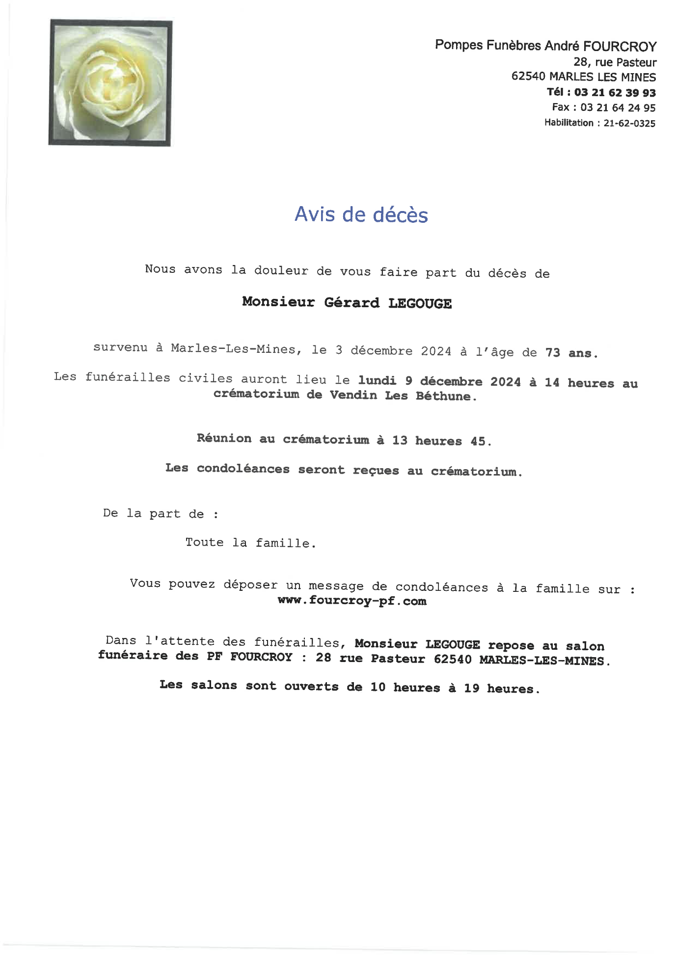 Décédé à Marles-les-Mines (62540, France) le mardi 3 décembre 2024 à l'âge de 73 ans