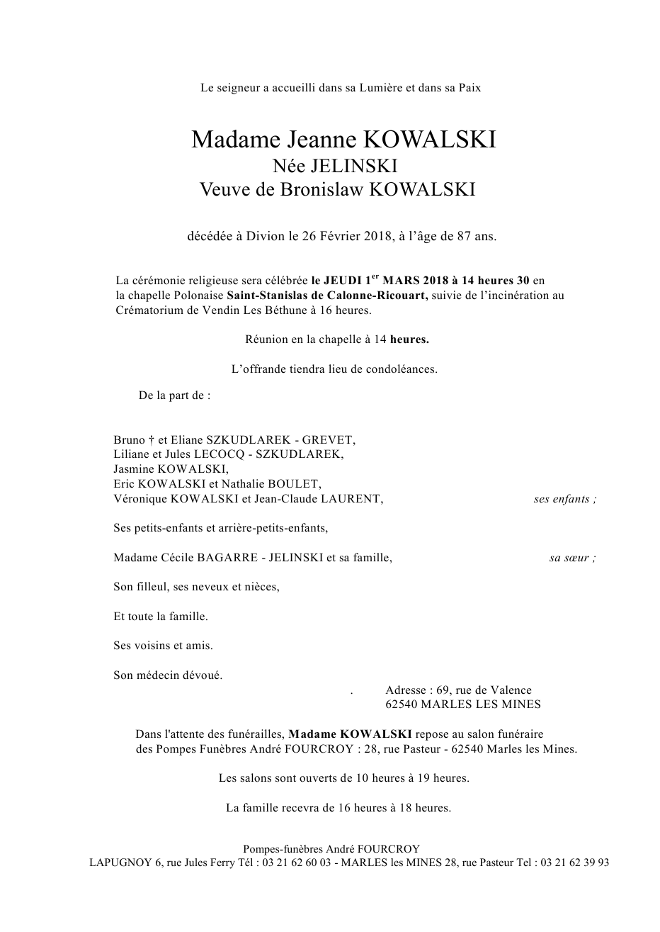 Epouse de Monsieur Bronislaw KOWALSKI