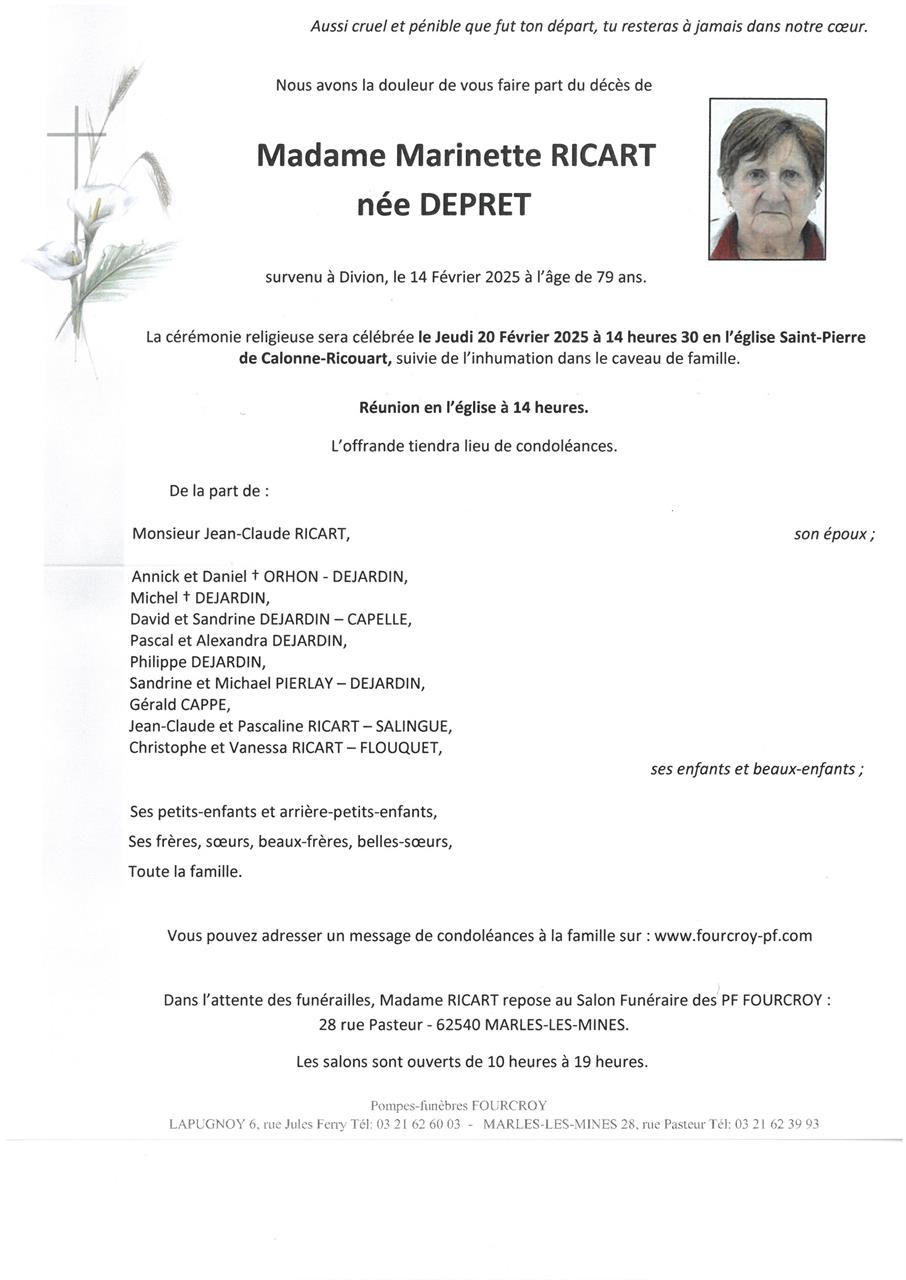 Décédée à Divion (62460, France) le vendredi 14 février 2025 à l'âge de 79 ans