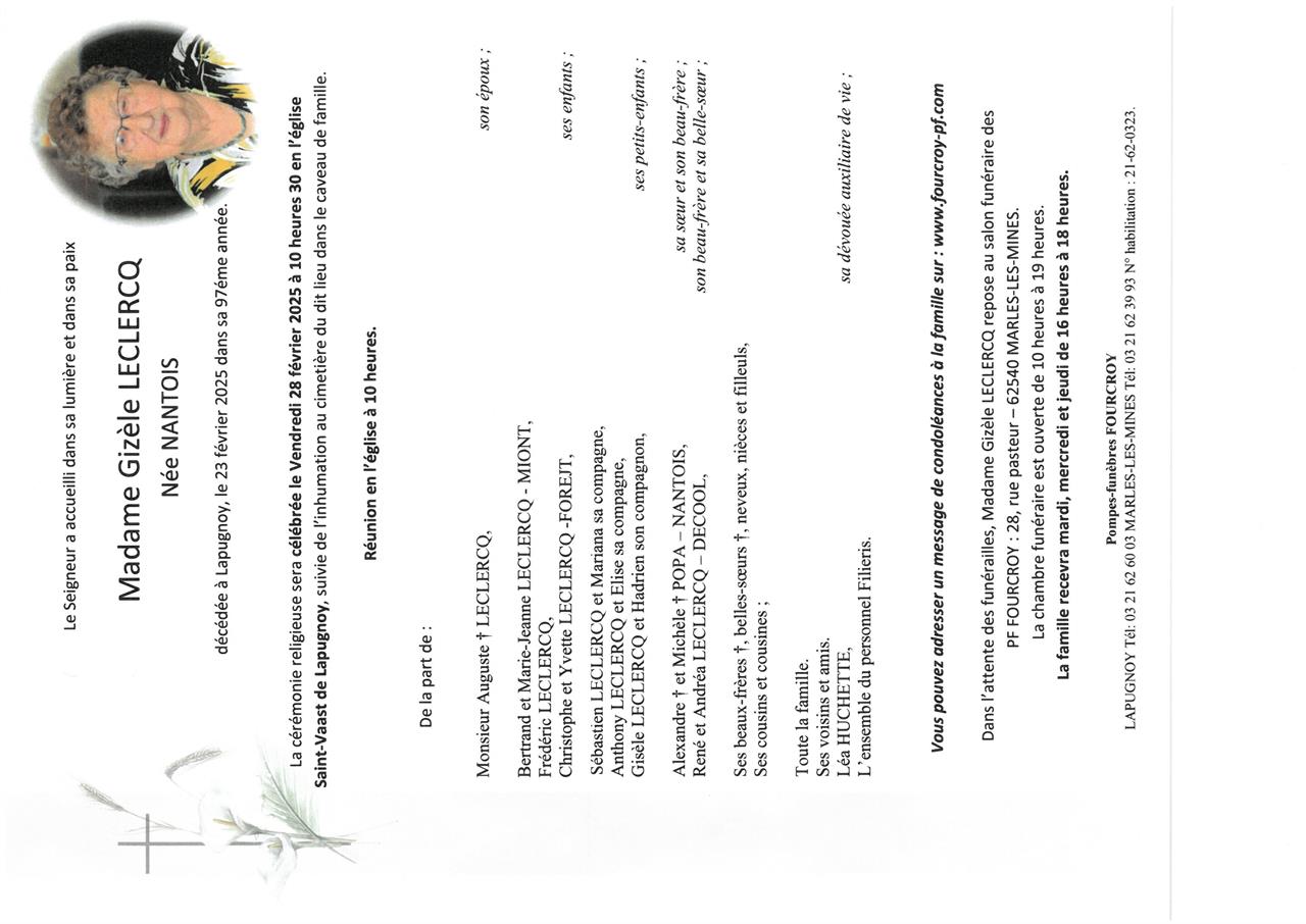 Décédée à Lapugnoy (62122, France) le dimanche 23 février 2025 à l'âge de 96 ans