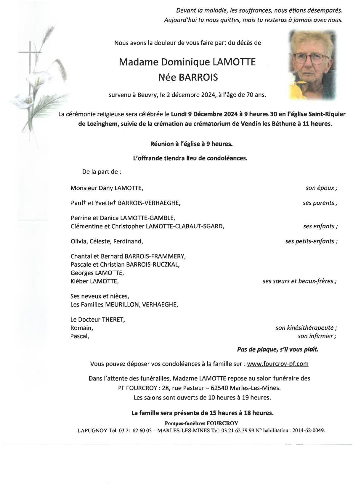 Décédée à Beuvry (62660, France) le lundi 2 décembre 2024 à l'âge de 70 ans