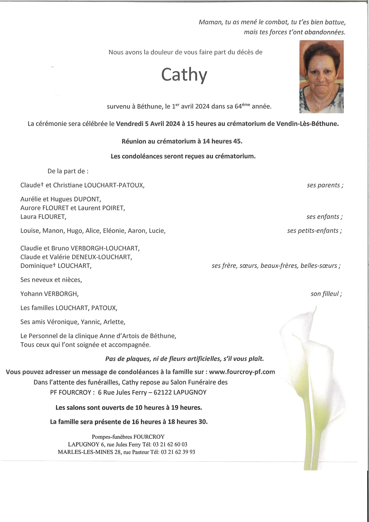 Décédée à Béthune (62400, France) le lundi 1 avril 2024 à l'âge de 63 ans