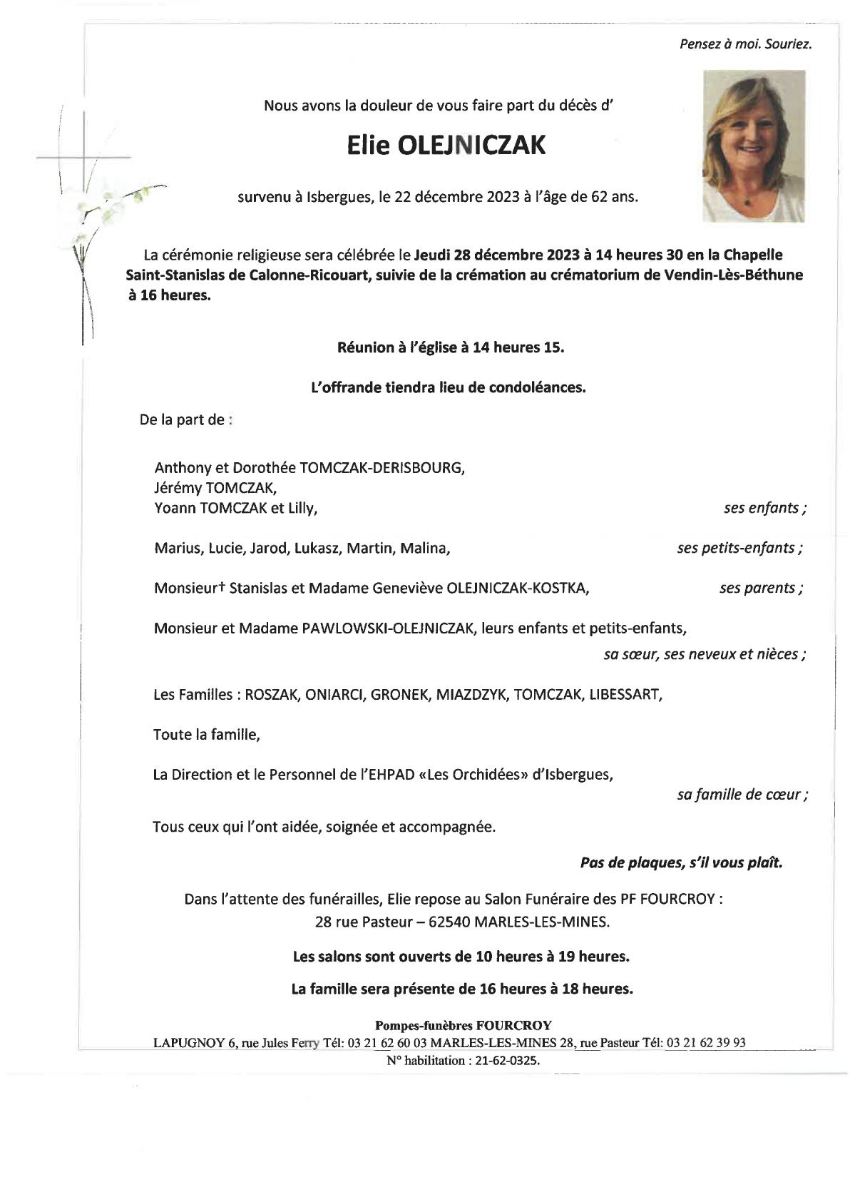 Décédée à Isbergues (62330, France) le vendredi 22 décembre 2023 à l'âge de 62 ans