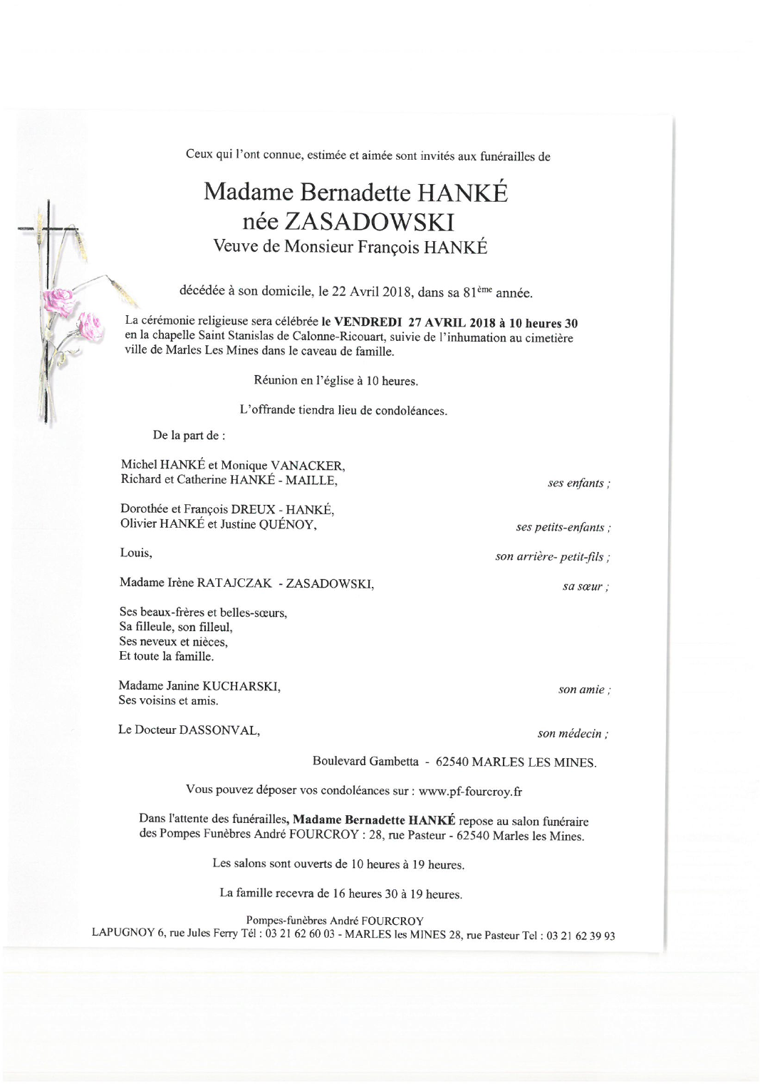 Décédée à Marles-les-Mines (62540, France) le dimanche 22 avril 2018 à l'âge de 80 ans