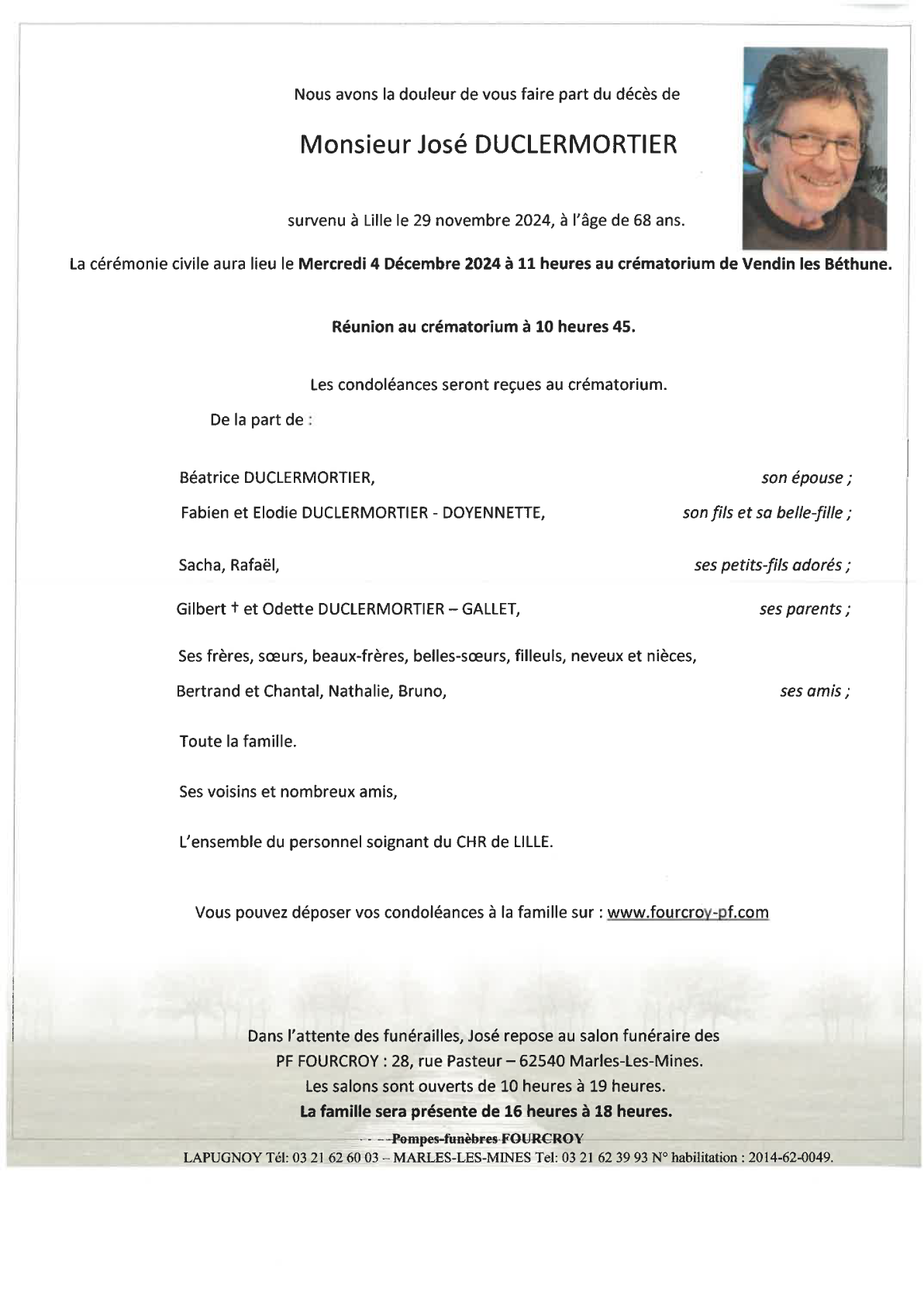 Décédé à Lille (59000, France) le vendredi 29 novembre 2024 à l'âge de 68 ans