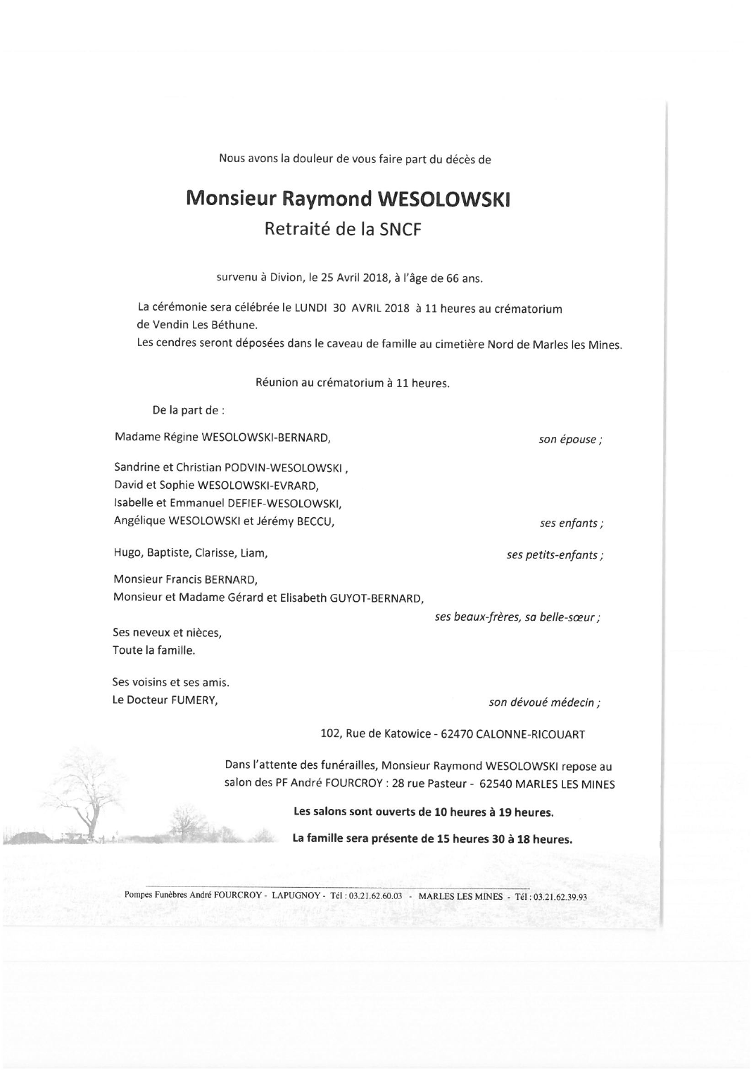 Décédé à Divion (62460, France) le mercredi 25 avril 2018 à l'âge de 66 ans
